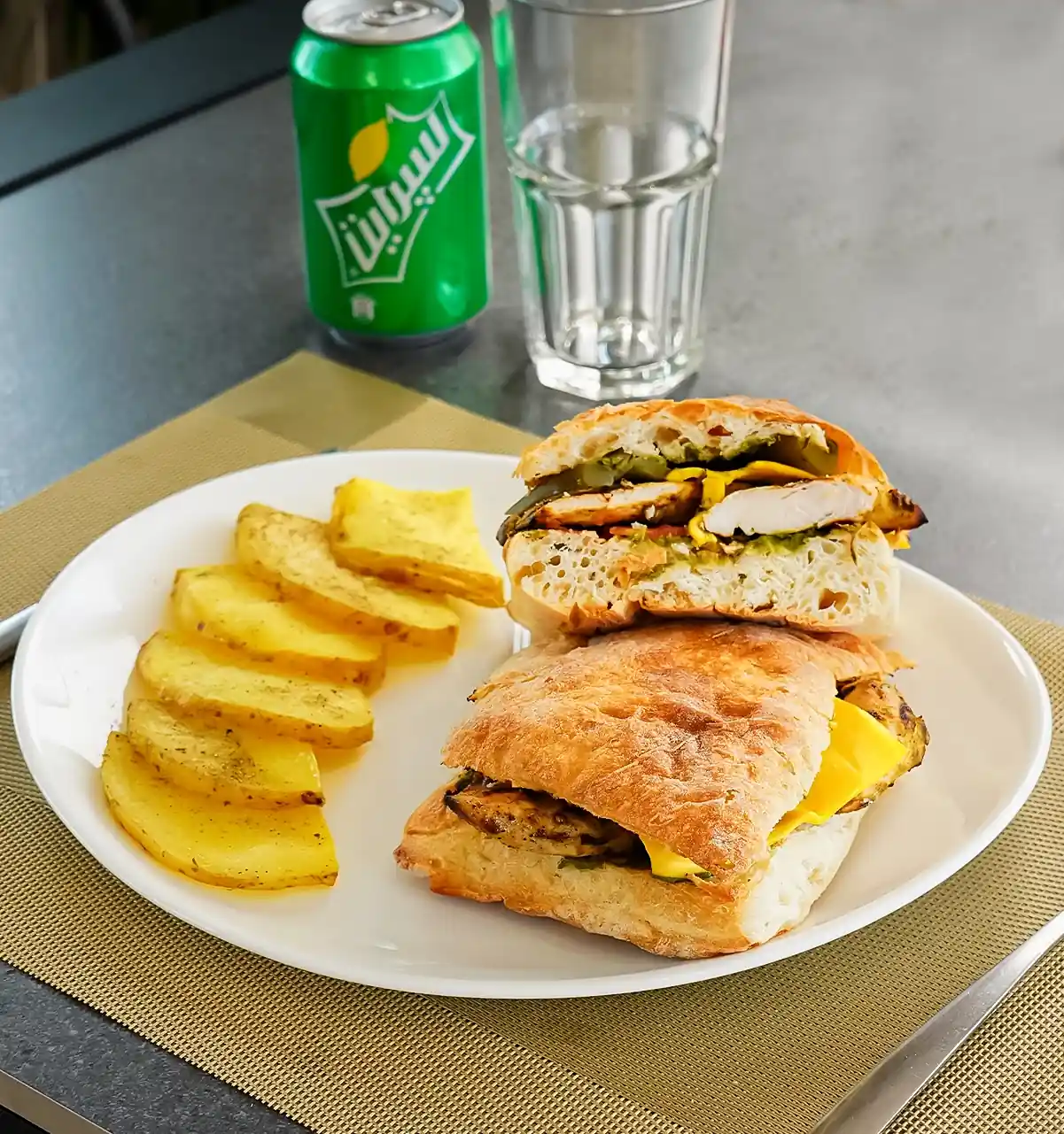 فیله مرغ گریل شده/ سس پستو/ نان چاپاتا /پنیر ورقه ای/ گوجه فرنگی/ ریحان تازه /سیب زمینی سرخ شده/ سس کچاپ